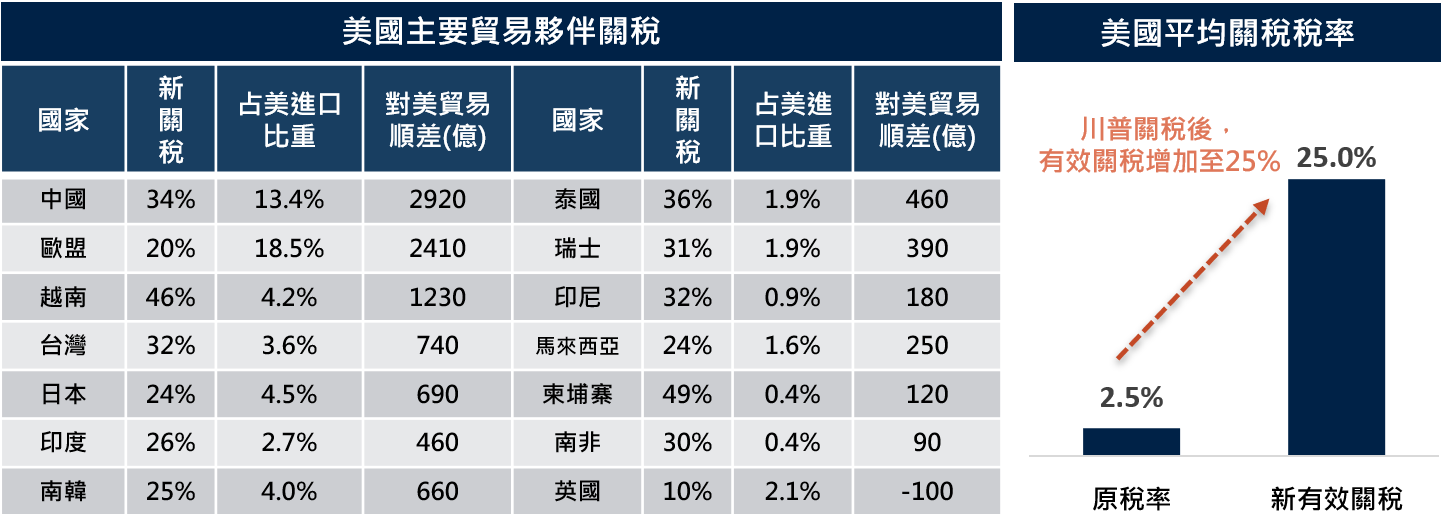 資料來源:(左圖)白宮,Bloomberg,貿易順差為2024數據;(右圖)各家券商,保德信整理,2025/04/04。