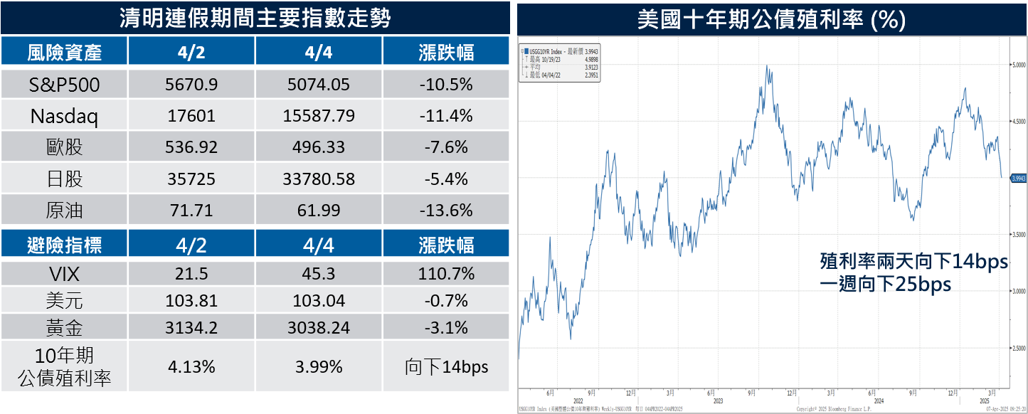 在川普關稅公布的兩個美國交易日(截至4/4美股收盤),S&P 500重挫10.5%,收在5074.05點;Nasdaq指數重挫11.4%,收在15587.79點;歐股大跌7.6%、日股大跌5.4%。市場恐慌情緒蔓延,VIX恐慌指數從21.5上升至45.3;美元指數先升後貶,收在103.04;債市指標,也就是美國十年期公債殖利率一度最低來到3.87%位置,最後收至3.99%,成為資金避險去處。