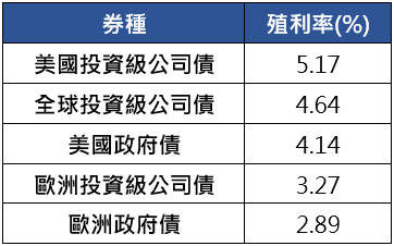 PGIM保德信美國投資級企業債券基金(本基金有一定比重得投資於非投資等級之高風險債券且基金之配息來源可能為本金)經理人張世民指出,比較成熟國家債券殖利率,以美國投資級公司債的5.17%最高,其次為全球投資級公司債的4.64%、美國政府債的4.14%,由於投資級企業債往往為較優質且評等較高的大型企業,在市場震盪時能保護資產避免大幅震盪。(資料來源:Bloomberg,2025/03/28)