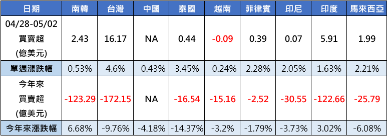 關稅擔憂暫緩,美股反彈,國際資金也跟著回流亞洲股市,上週除了越南遭資金淨流出之外,其他市場全數獲得外資買盤回補,其中之前遭大幅提款的台股單週獲得逾16億美元的挹注,之前弱勢、目前正透過談判扭轉頹勢的印度市場,也獲得外資回補近6億美元,其他包括南韓、馬來西亞等則分別吸金2.43億美元、1.99億美元。(資料來源:Bloomberg,2025/05/02)