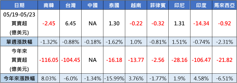 歷經數週反彈之後,亞股進入高檔震盪,情緒仍維持正向樂觀,上週外資對亞股轉為有買有賣,表現較差的為印度單週失血14.34億美元,以及南韓遭賣超2.45億美元,相對地,台股連續4週持續獲得外資青睞,上週以6.45億美元資金挹注最佳,東協的泰國、印尼也雙雙獲得逾1.3億美元買盤回補。(資料來源:Bloomberg,2025/05/23)