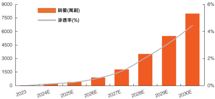 根據券商統計,2024年全球AI眼鏡銷售量已達200萬副,進入2025年業者有望持續積極佈局探索AI智慧眼鏡領域,推動2025全年全球出貨量進一步成長至400萬副;而進入2030年,在AI+AR技術可望成熟相互搭配之下,智慧眼鏡將進入高速發展期,根據預估,2030年全球AI智慧眼鏡出貨量可望成長至8000萬副,整體2023年至2030年的年複合成長率將高達134%。(資料來源:平安證券,保德信,2025/07)