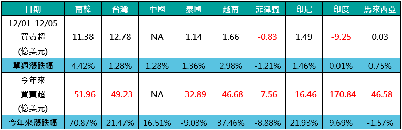 市場投資情緒好轉,12月首週外資對亞股再度轉為買超居多,上週國際資金明顯回補東北亞雙雄,台股獲得近13億美元挹注,南韓股市也獲買超11.38億美元,再度成為外資最愛兩大市場,僅有印度、菲律賓遭賣超,其中印度股市單週資金淨流出9.25億美元,表現為亞股墊底市場。(資料來源:Bloomberg,2025/12/05)