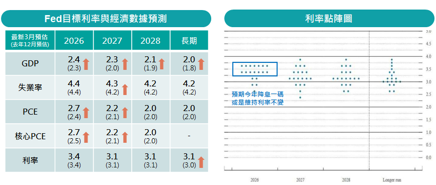 聯準會主席鮑爾指出,美伊戰事影響仍充滿不確定性,聯準會在抑制通膨方面的進展「不如原先預期」。短期內能源價格上漲勢必推升整體通膨,但目前仍難以評估其對經濟造成的影響範圍與持續時間,且尚未看到中東衝突影響即將消退的明確跡象。此外,聯準會也將通膨預期(核心PCE)自2.5%上修至2.7%。