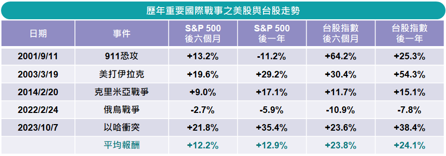 我們認為,中東戰事引發市場對原油供給受阻的憂慮,短期通膨與市場波動風險隨之升高。不過,回顧過去五次重大國際戰事的經驗(如下圖),雖然事件初期股市往往出現震盪甚至下挫,但隨著不確定性逐步消化,資金回流風險性資產。統計顯示,戰事發生後半年與一年,美股平均漲幅約12%、台股更有23%的上漲空間,顯示地緣政治衝擊多屬短線干擾,中長期趨勢仍回歸基本面與經濟成長動能。