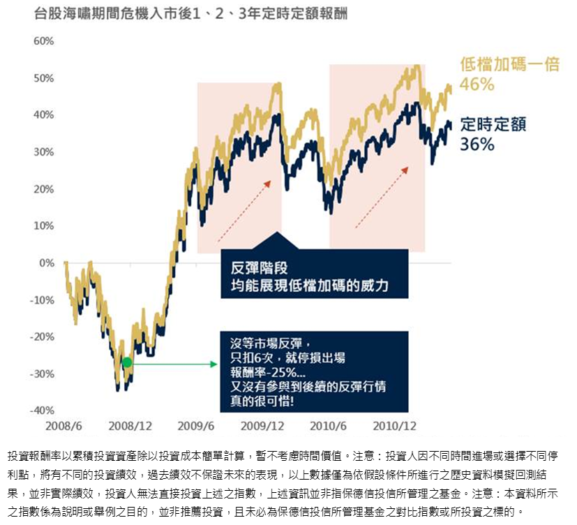 註:以台灣加權指數為例。資料來源:Bloomberg,2008/6/6~2010/12/6,保德信投信整理。定期定額投資定於每月6日扣款,每次投入1萬元,未停損未停利。定期不定額投資定於每月6日扣款,每次投入1萬元,遇扣款前一營業日基金之淨值低於基金單位成本(累積成本/累積單位數)之10%時,則加碼兩倍買進(扣款2萬元),未停損未停利。