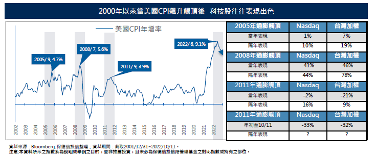 再者,我們認為美國通膨已於6月觸頂,且就參考過去2000年以來,當CPI飆升觸頂後隔年,科技類股即呈現出色表現,有鑑於今年通膨已見頂,且隨未來貨幣調控力道可望隨通膨逐漸回落而放緩的環境下,不僅風險性資產的能見度有機會明顯提升,以科技產業為經濟主動脈的台股企業的獲利潛力亦將提升。