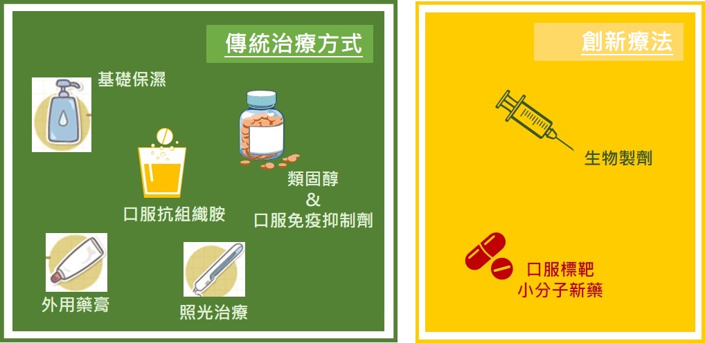 傳統治療從乳液、保濕或藥膏,口服藥物則有類固醇、免疫抑制劑等。但傳統免疫抑制劑得花費數週、甚至數月才能發揮效果,且會造成白血球降低,增加感染風險,副作用明顯。因為好發族群是兒童及青少年,所以相關療法的安全性又更受重視。