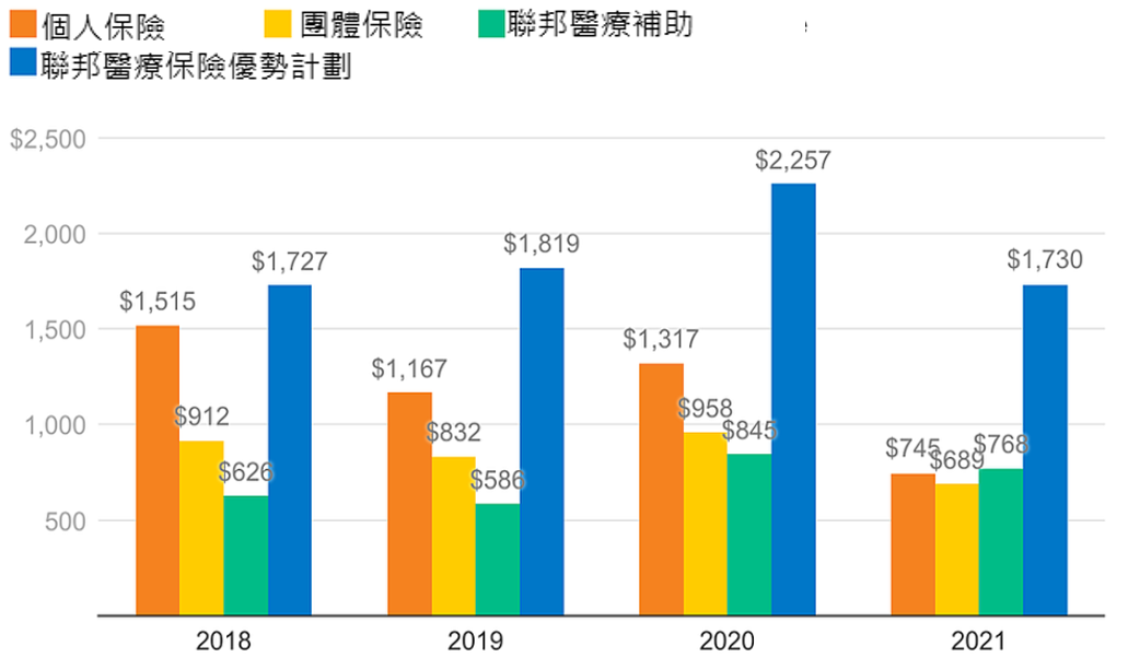 截至2021年底的4年連續保險財務資料分析顯示,相較於個人保險、團體保險以及由聯邦和州政府共同提供經費的聯邦醫療補助,聯邦醫療保險優勢計劃為保險公司帶來最大幅度的毛利率貢獻度。