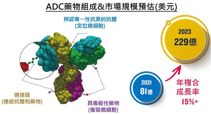 相較於傳統化療的無差別攻擊,往往造成病人虛弱、而標靶藥物的原理則是定位癌細胞上的特定目標,進而抑制細胞訊息傳遞,但殺傷力則有限。ADC的概念則是整合標靶的特性再加上化療,精準鎖定癌細胞後,再釋放所攜帶之化療藥物,在抑制腫瘤生長及殺死癌細胞的機會更大。