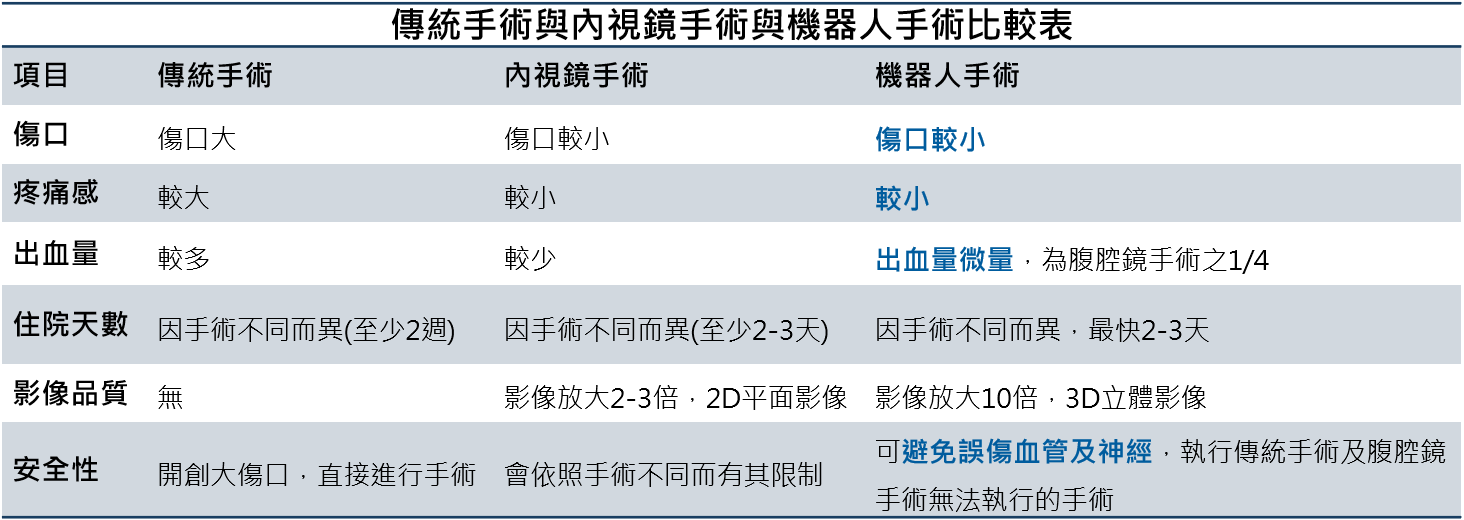 機器人輔助手術與傳統內視鏡微創手術最大的差別,在於內視鏡看的體內是2D平面的影像,手術器械角度也有所受限;而機器人輔助手術具有3D立體影像傳導,透過AI技術又可同步模擬外科醫師手、腕、指等動作,能更精準並降低誤差的完成手術,因此也被稱為進階版的腹腔鏡手術。