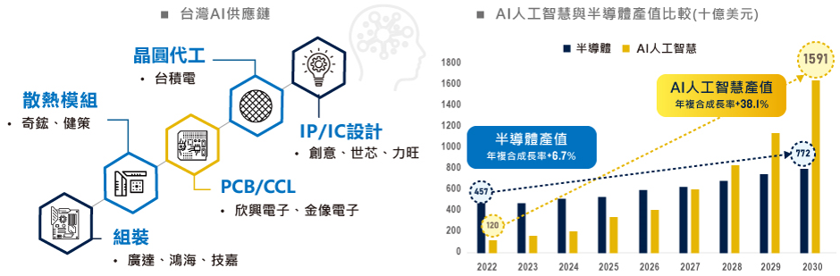隨生成式AI崛起,為相關供應鏈帶來爆發性成長機會,根據Precedence Research研調機構預估,相較於相對成熟的半導體產業,2030年全球AI人工智慧產值將達1.59兆美元,年複合成長率高達38.1%,未來AI的黃金十年才正要起飛!而身為AI軍火庫的台灣,擁有完整AI供應鏈,將吸引資金持續挹注。