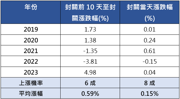兔年封關進入倒數階段,自25日起算台股還有8個交易日就要兔年封關,根據歷年統計,封關前10日個交易日至封關當天,台股指數漲多於跌,仍有行情可期,平均上漲0.59%,而農曆封關日當天大盤上漲機率更是高達八成,惟因為面對春節長假,資金態度往往轉趨較為保守態度,因此平均略為上漲0.15%。(資料來源:CMoney,保德信整理,2023/01)