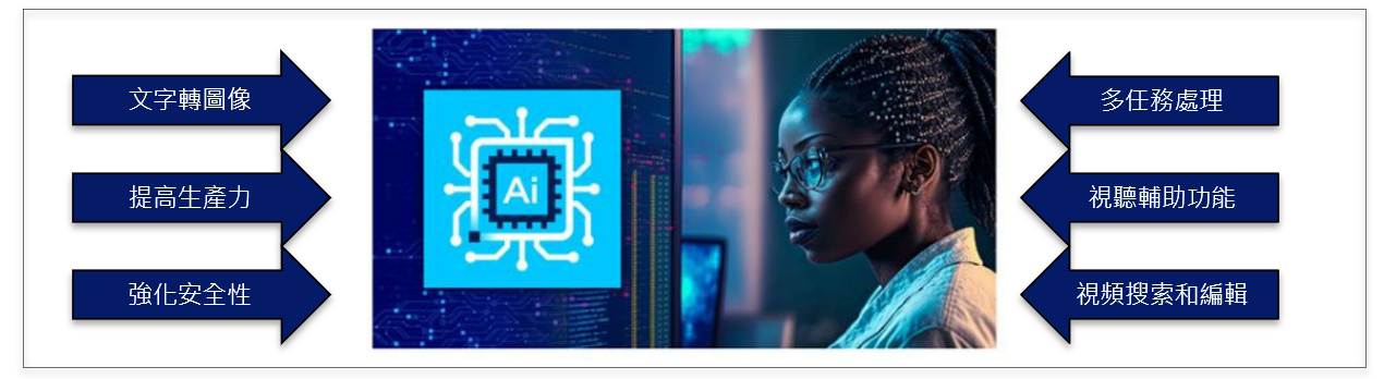 設備的領導地位;AI電腦到底有多大的魅力?與傳統電腦又有著什麼顯著的差異呢?首先在硬體備配上,新增的Copilot鍵開啟了AI賦能的Windows PC時代,而在軟體功能上,包括可以將文字轉換成圖像以強化用戶進行影音編輯的創作輔助功能、寫作、創作和編碼的輔助功能、多任務處理使用戶體驗更流暢,以及語音識別和語音合成,使創作效能再提升等…。也因此,各軟體公司也開始爭先透過產品開發來搶奪AI 電腦的市佔大餅。