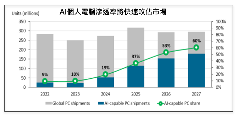 隨著AI軟體應用在生活的普及率快速提升,研調機構預期2024年全球AI個人電腦的滲透率將達到19%,並最快在3年內提升至6成的電腦市占率,而隨著AI個人電腦放量出貨,也將有助於推升相關產業鏈訂單量,並加速PC市場重返成長軌道。