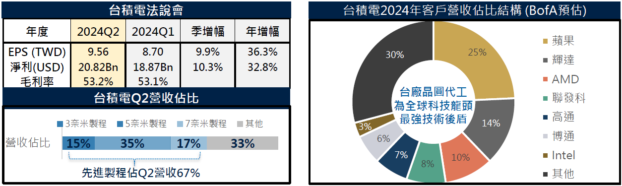 資料來源:(左圖) TSMC,2024/7/18;(右圖) BofA Global Research, 2024/7/10。 注意:本資料所示之指數或個股係為說明或舉例之目的,並非推薦投資,且未必為保德信投信所管理基金之對比指數及或持有之部位。
