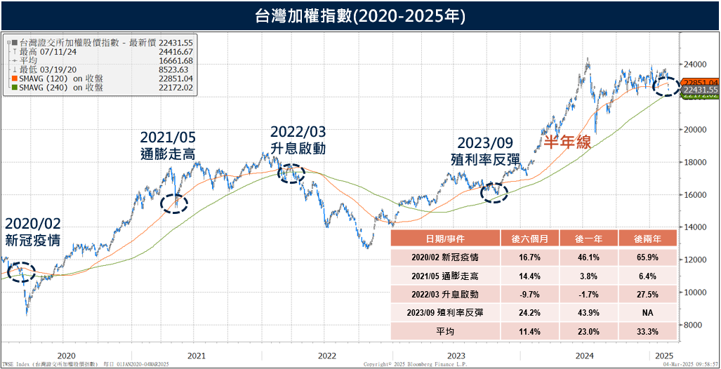 資料來源:Bloomberg,保德信整理,2025/03/04。表格所統計的事件數據,為過去五年中,每年度首次跌破半年線的時點來計算。