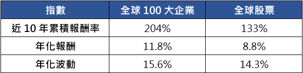 資料來源 : Bloomberg,保德信整理,2015/03/31~2025/03/31;全球100大企業以標普全球100指數為例、全球股票以MSCI世界指數為例。注意:本資料所示之指數或個股係為說明或舉例之目的,並非推薦投資,且未必為保德信投信所管理基金之對比指數或所持有之部位。以上指數報酬率計算公式如下:[(終值/前值)-1]*100%。上述提及之指數報酬率均為含息報酬率,意指利用指數所計算之投資報酬率中,亦包含現金股利之報酬。以上僅為ETF追蹤指數績效或殖利率之表現,不代表本ETF基金之實際報酬率或配息率及未來績效保證,不同時間進場投資,其結果將可能不同,且並未考量交易成本。