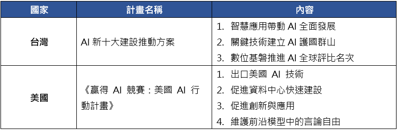 保德信全球藍籌ETF(本基金之配息來源可能為收益平準金) (009810)經理人黃相慈指出,台灣的AI新十大建設推動方案,將涵蓋智慧應用、關鍵技術、數位基磐三大主軸,並以10項戰略建設落實相關政策,進一步擴大台灣AI影響力,而美國則欲達到優先考慮 AI 的創新和應用目的,在行政上加速AI發展,進而達到加快人工智慧超級電腦的建設、加速新資料中心和工廠的建設等目標。(資料來源:國發會、Bloomberg,2025/07/23)