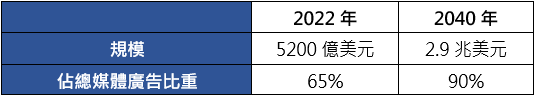 從廣告規模成長可明顯見到趨勢發展,根據統計,數位廣告收入將從2022年的5200億美元,上升至2040年的2.9兆美元,複合年增長率達8%至10%之多,且這項趨勢,有很大一部分源於廣告支出從傳統媒體流向數位媒體,統計顯示,2022年數位廣告佔廣告總額約65%,然而到了2040年,比例將快速躍增至80%至90%。(資料來源:麥肯錫,保德信整理,2025/07/15)