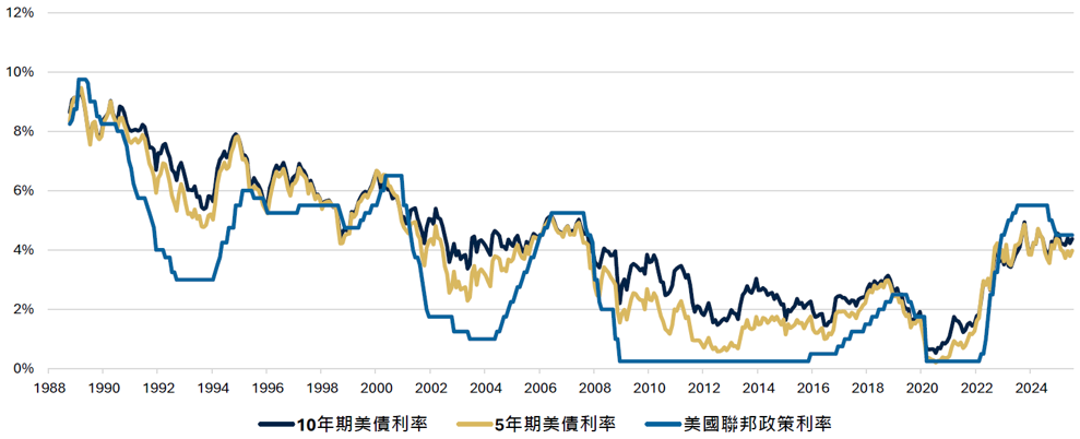 PGIM保德信美元非投資等級債券基金(本基金之配息來源可能為本金)經理人張世民表示,聯準會後續降息時點仍受關稅影響而出現雜音,但可以確定的是降息趨勢不會改變,且聯準會官員近期態度轉趨鴿派,9月降息幾乎已成市場共識,寬鬆的貨幣政策有助壓抑利率上行壓力,並提振市場信心。根據過去歷史資料顯示,只要降息循環持續,往往有利帶動公債殖利率持續下行,中期美債殖利率亦有下行空間,創造債券資本利得的機會。(資料來源:Bloomberg,2025/07/31)