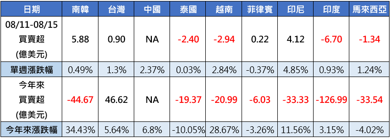美股持續創高,然市場樂觀氣氛並未全數反映在外資對亞股的買盤,上週國際資金對亞股有買有賣,獲得最多資金挹注的為南韓股市的5.88億美元,其次為印尼股市的4.12億美元,台灣與菲律賓力守資金淨流入,相對地,印度單週遭提款6.7億美元墊底,越南、泰國也雙雙遭賣超超過2.4億美元。(資料來源:Bloomberg,2025/08/15)