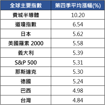 時間即將進入第四季,根據歷年數據統計,第四季不僅股市易漲難跌,且近10年漲勢強勁的市場主要集中在美國、日本、歐洲等成熟國家,其中美股更是在多頭表現之下,包括費城半導體、道瓊、羅素2000、S&P500等主要指數全數擠進近10年全球前10強指數排行,且最強的費半指數平均漲幅超過10%。(資料來源:Bloomberg,2025/09/11)