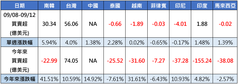 AI題材領漲,帶動東北亞雙雄持續獲得外資買盤挹注,上週國際資金再度強勢買超台韓股市,其中台股獲得超過56億美元挹注,穩居亞股單週吸金冠軍,南韓也獲得逾30億美元資金,為第二吸金股市,反觀東協全數呈現資金淨流出。(資料來源:Bloomberg,2025/09/12)