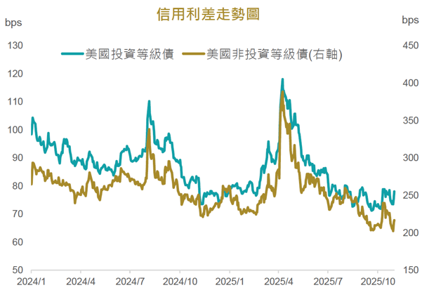 AI浪潮席捲全球,債市也受到AI相關企業發債牽動,10月AI基礎設施的融資需求大幅攀升,根據美國銀行數據顯示,Meta、甲骨文等的投資級債券市場供應總計達750億美元,此金額還不包括由銀行組合的甲骨文與超大規模資料中心營運商Vantage相關的380億美元貸款,由於短線增加發債量明顯超過過去平均值,因而出現信用利差出現落底反彈的跡象。(資料來源 : Bloomberg、BofA,2025/10)