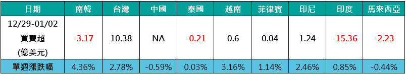 除了外資買單,亞股表現也相當爭氣,上週以韓股大漲4.36%表現最佳,其次為越南股市的3.16%,台股與印尼股市單週分別上漲2.78%、2.46%也相當亮眼,僅有馬來西亞、陸股兩市收黑。(資料來源:Bloomberg,2026/01/02)