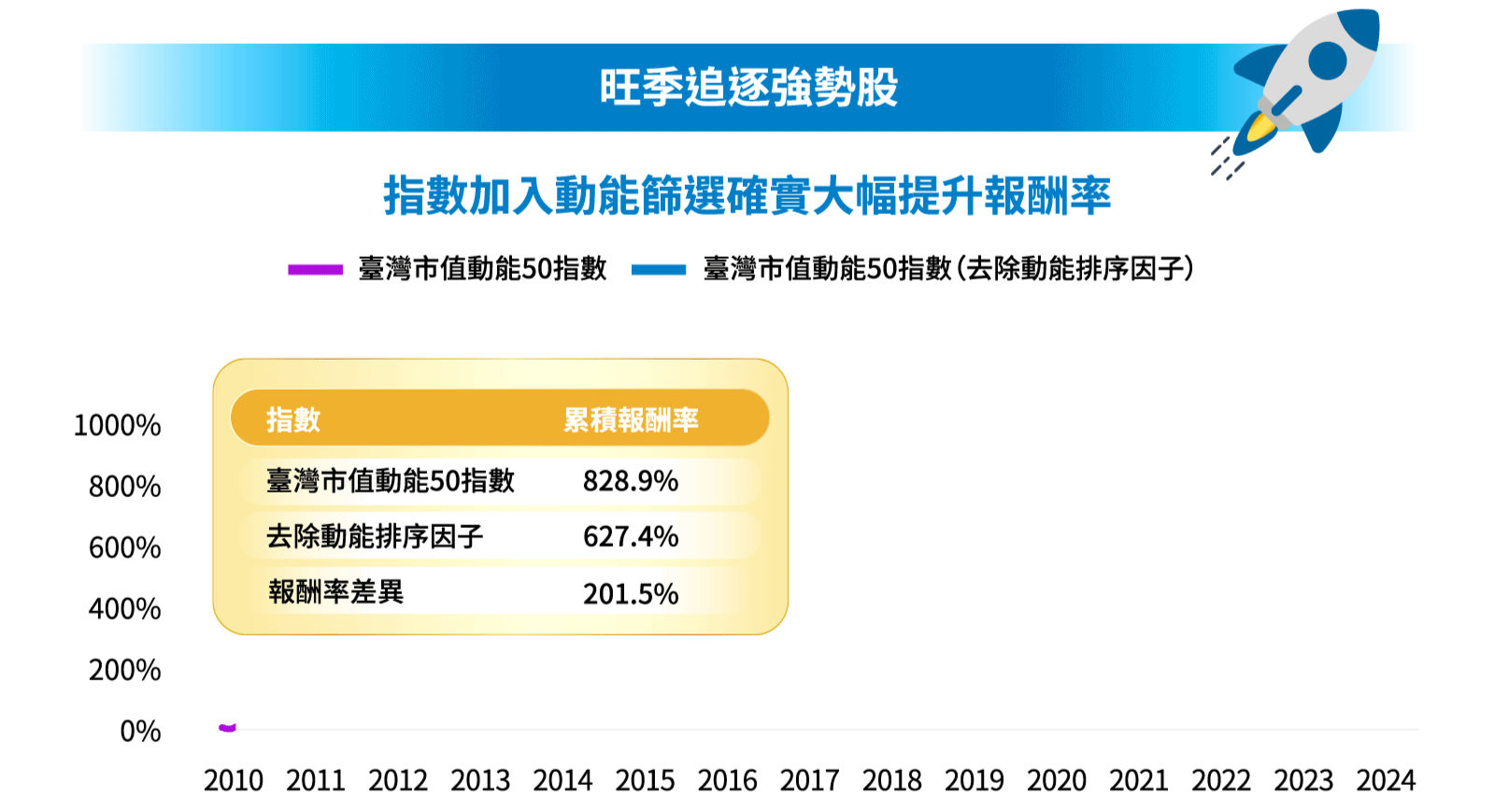 市值2.0開新局!市值x動能x成長因子加乘,相較加權指數,臺灣市值動能50指數表現亮眼, 專注績效,毋需多言。